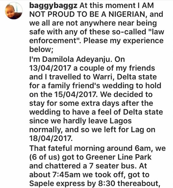 Man Narrates His Horrible Experience With Policemen In Sapele I'm not a proud Nigerian, a man declares, as he narrates his near-death encounter with some policemen. It's a long read. Just be patient.